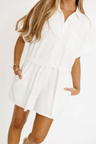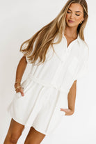 GARMENT DETAILS: Lightweight cotton shortie romper with collared neckline, short sleeves, and belted waist. Finished with side pockets and a single chest pocket.