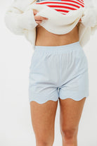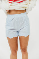 GARMENT DETAILS: Lightweight cotton poplin shorts with elastic waistband and scalloped hem. Features dual in-seam pockets. No lining.