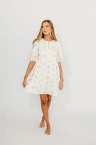 GARMENT DETAILS: Delicate floral summer dress in a long mini length, with 1/2 length sleeves, rounded neckline, and dainty eyelet lace details. Features an open front style with functional and adjustable ties.