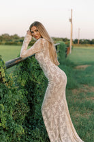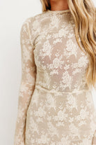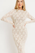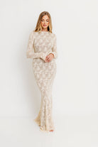 GARMENT DETAILS: Feminine cream maxi dress with high rounded neckline, long sleeves, and fit-and-flare silhouette with paneled, flared skirt. Features a delicate floral lace overlay, eyelet trim, and back zip with full neutral lining.