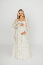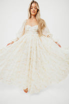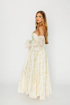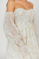 GARMENT DETAILS: Premium floral maxi dress in a lightweight, shirred chiffon. Features a soft bustier-style bodice (no boning), sweetheart neckline, smocked back panel, and sheer long sleeves with elastic cuffs and ruffles. Sleeves can be worn on or off the shoulder. Finished with a sweeping maxi-length skirt. Lined.