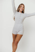 GARMENT DETAILS: Cozy soft knit bodysuit and shorts set. Bodysuit features thong-style construction, long sleeves, and 1/2 front button placket. Shorts feature an elasticated waistband.