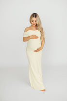 GARMENT DETAILS: Sleek and fitted maxi dress in a luxuriously soft premium knit. Features a folded off-the-shoulder neckline with short sleeves and a fit-and-flare design that is fitted through the hips and thighs and flares at the knee. Fully lined for maximum coverage and comfort.