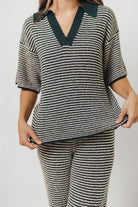 GARMENT DETAILS: Soft sweater knit top and pants set. Top features relaxed short sleeves, collared V-neckline, and contrast color trim. Full-length pants feature elasticated waistband and wide-leg silhouette.