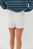 GARMENT DETAILS: Lightweight cotton knit shorts with elasticated waistband, drawstring detail, and side pockets. Features a cute ruffled hem and lining.