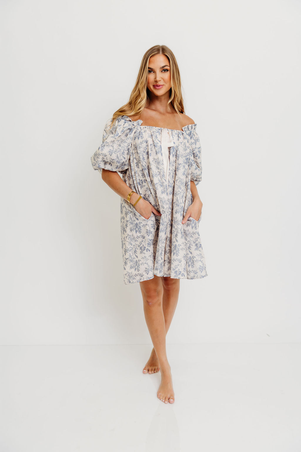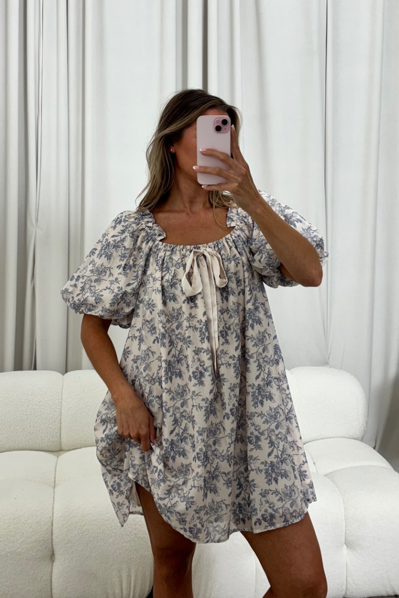 Inaya 100% Cotton Puff Sleeve Babydoll Mini Dress in Blue Multi *Final-Sale*