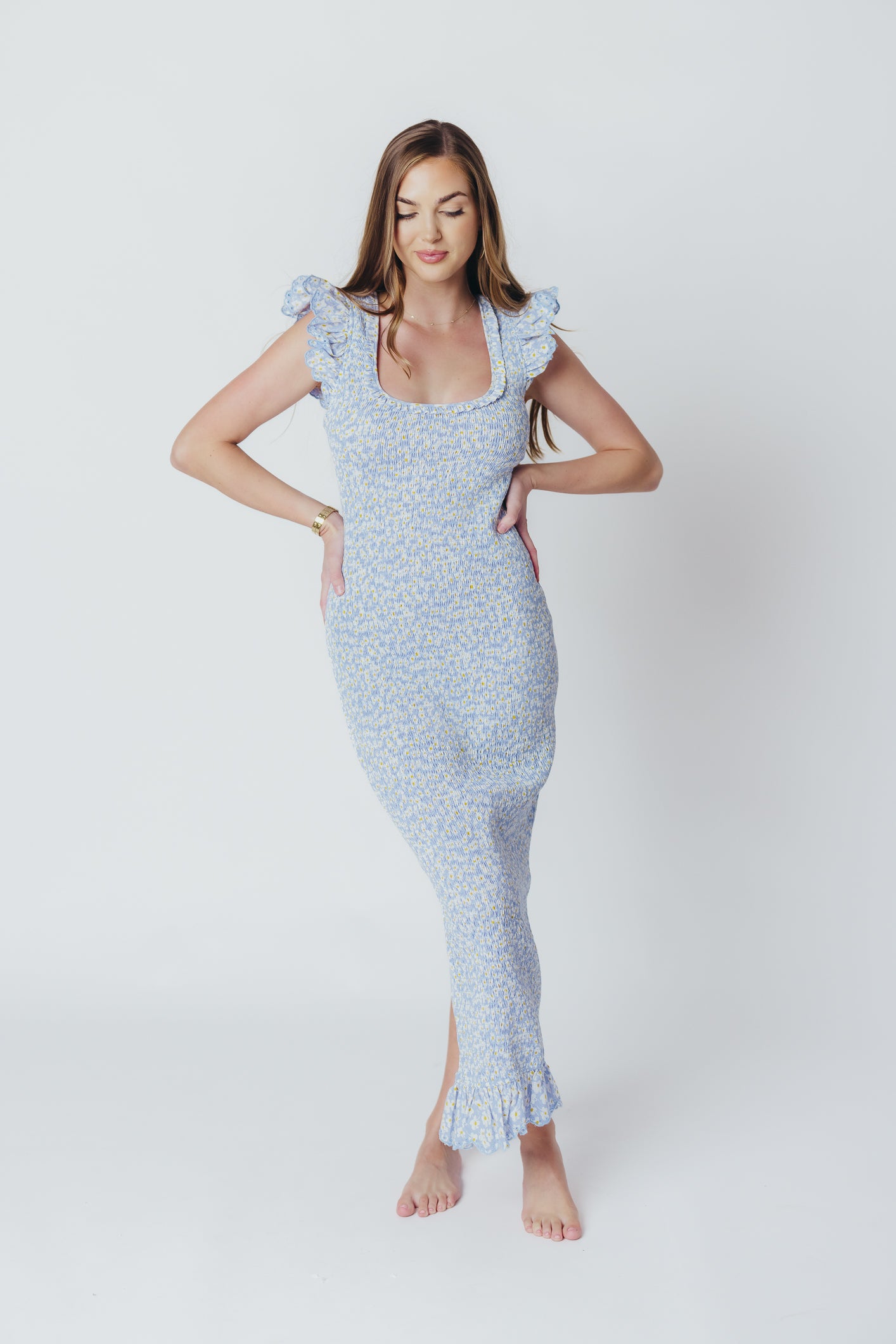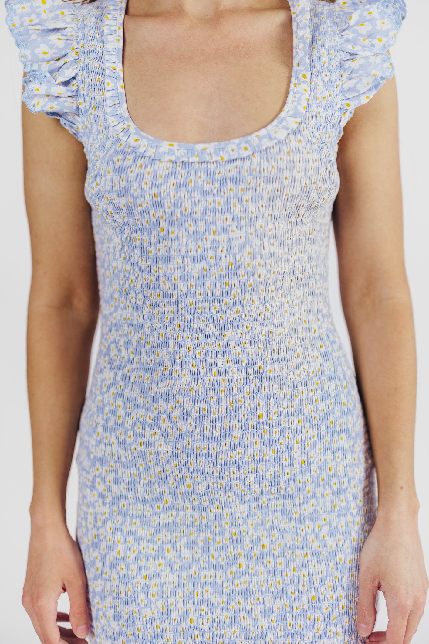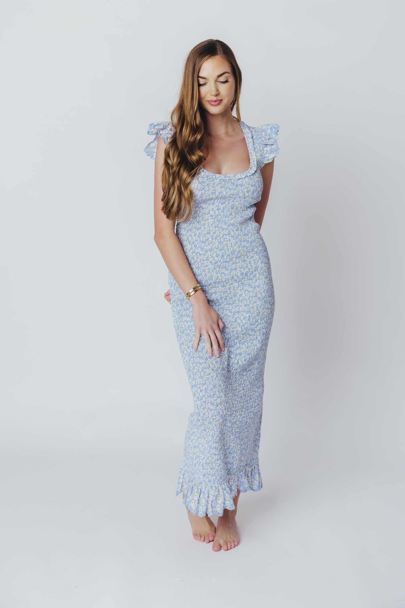 Sarah Smocked Midi Dress with Ruffled Eyelet Trim in Light Blue
