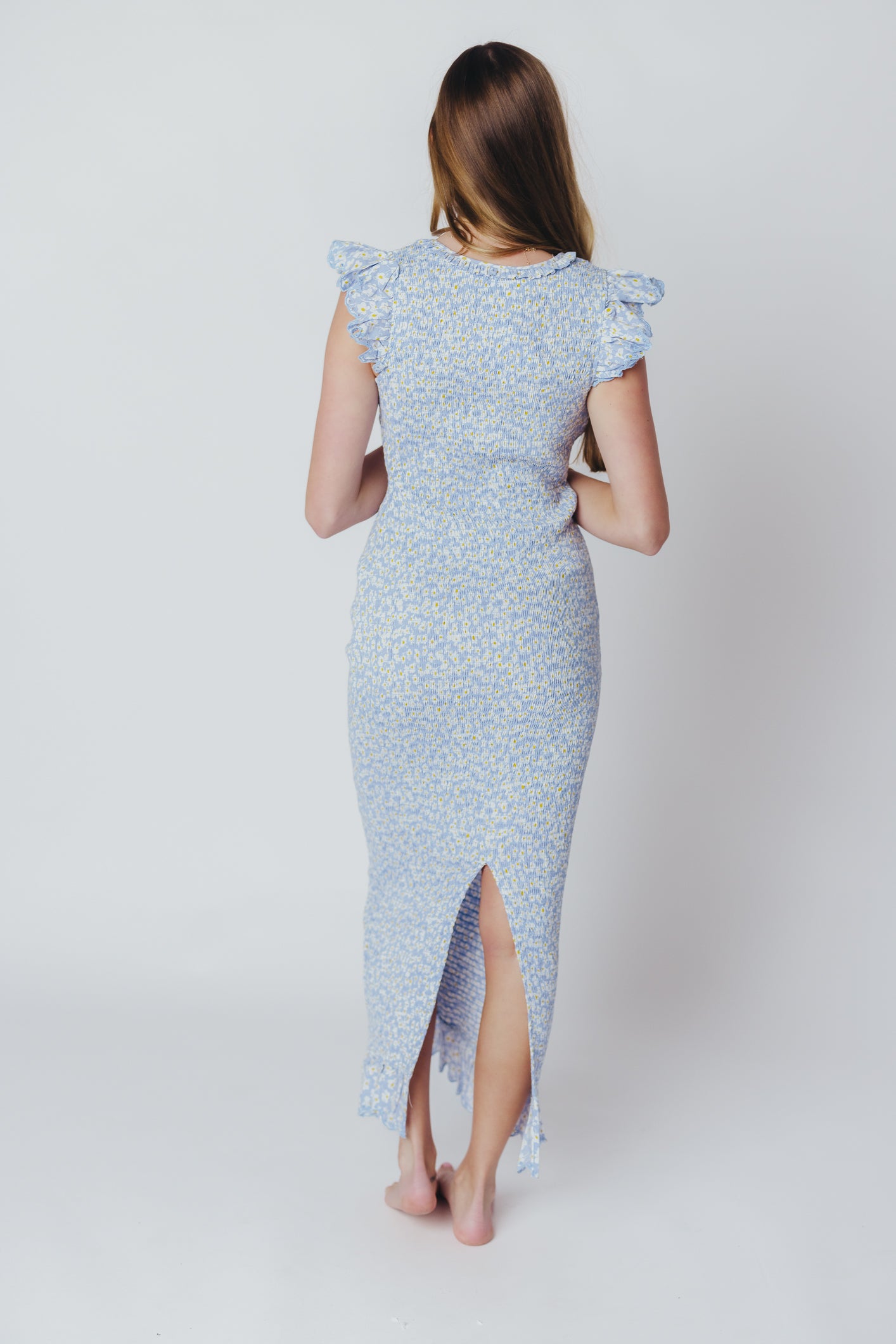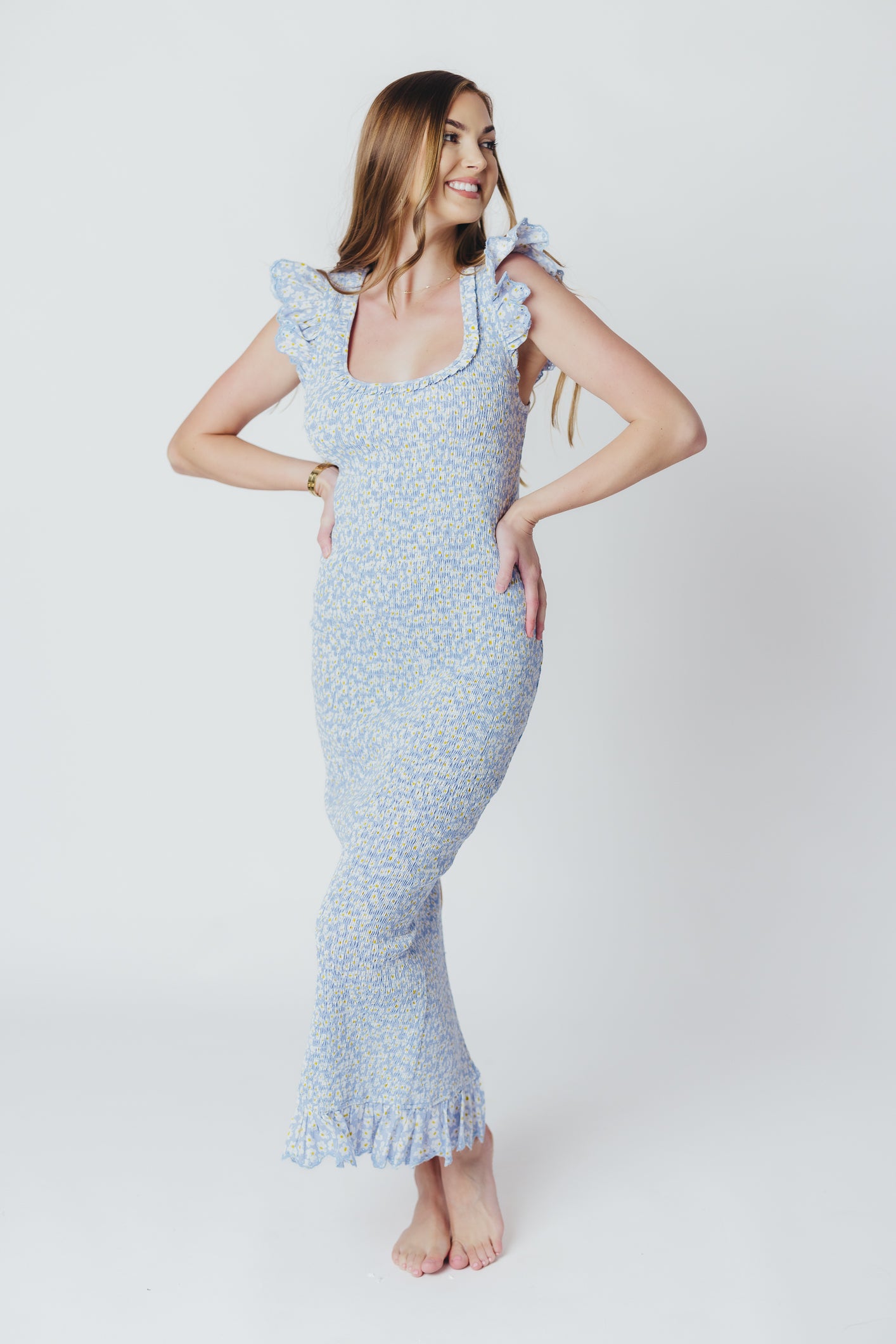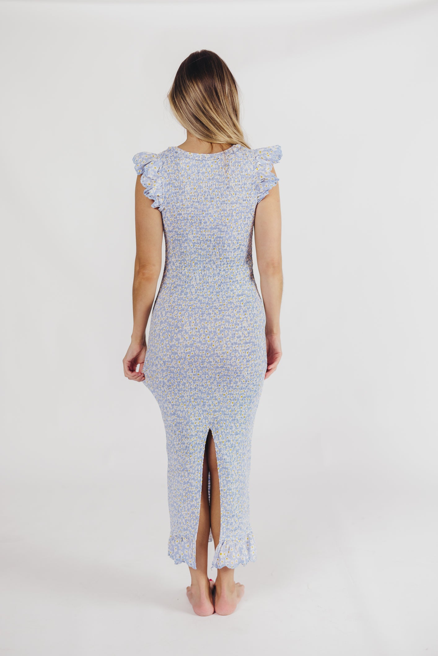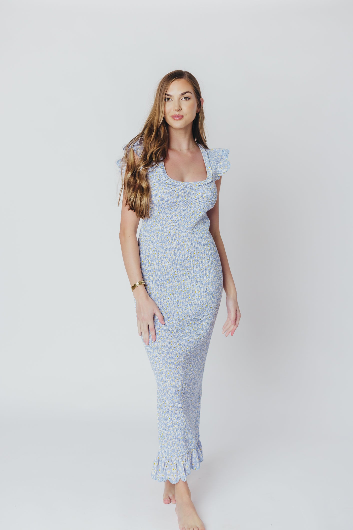 Sarah Smocked Midi Dress with Ruffled Eyelet Trim in Light Blue