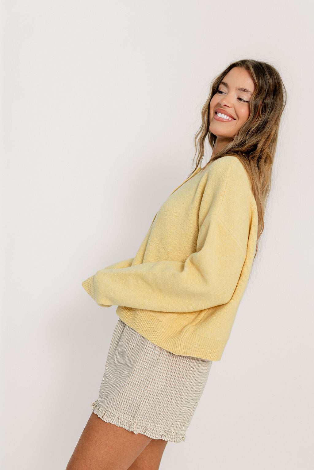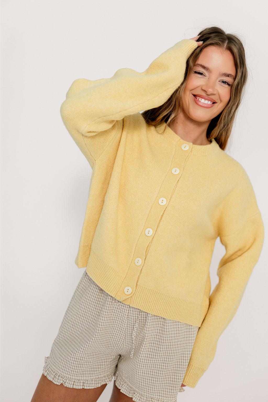 GARMENT DETAILS: Cozy knit cardigan, with rounded neckline, dropped shoulders, and long sleeves. Features front button placket and gentle crop.