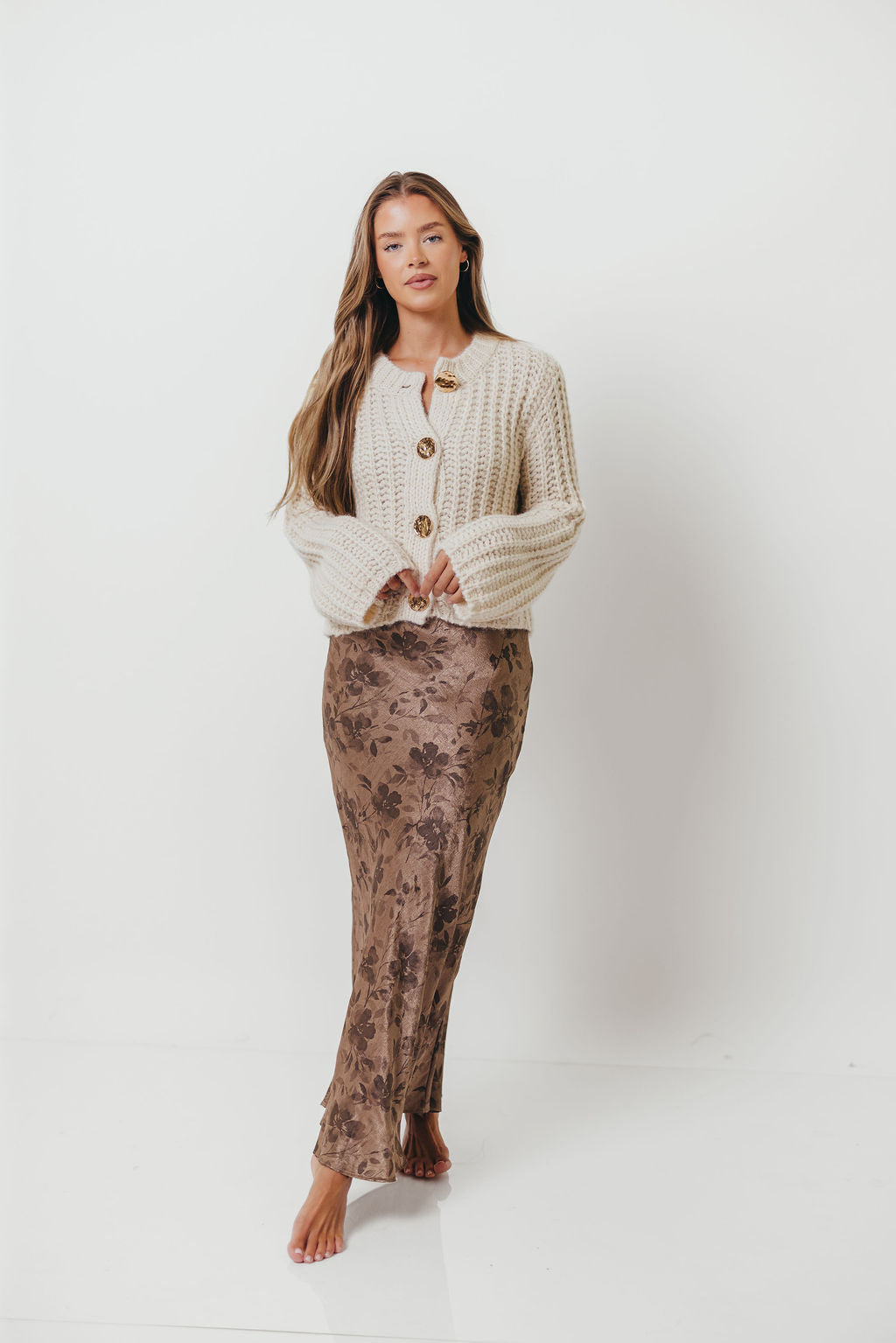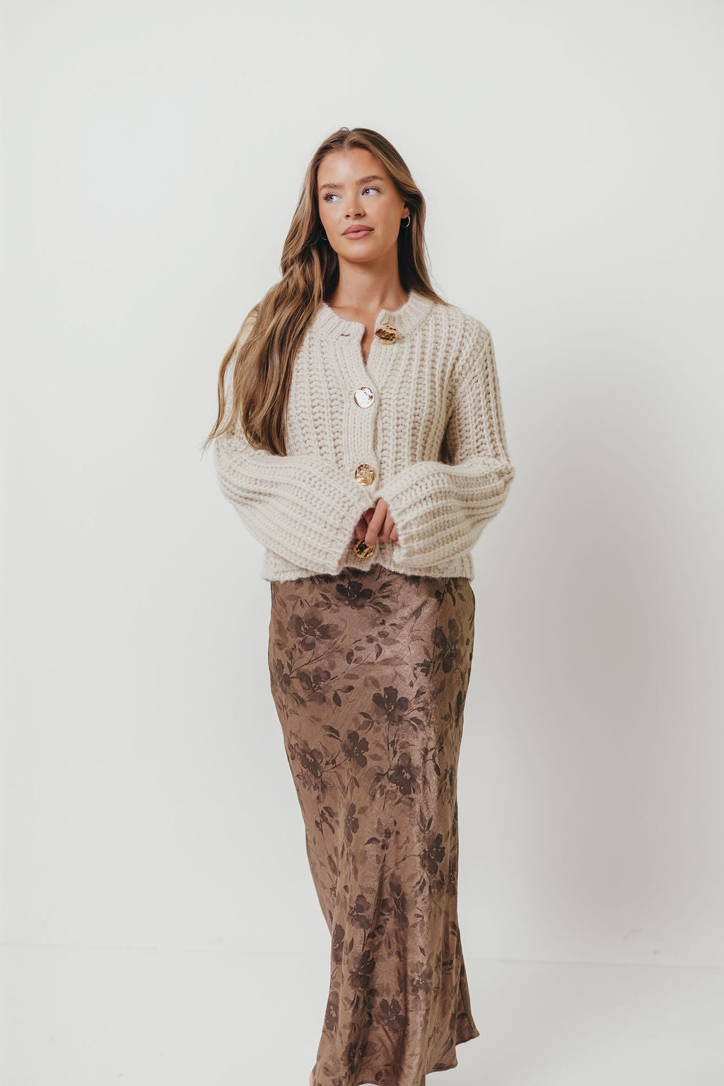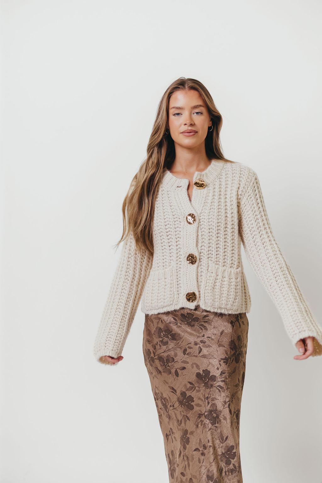 Nothing says comfort like the new Goldie Chunky Cardigan! This gorgeous wool-blend top is sophisticated and charming, with shiny gold buttons that add a dash of sparkle to your everyday look.