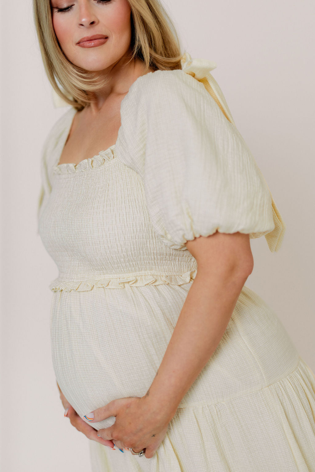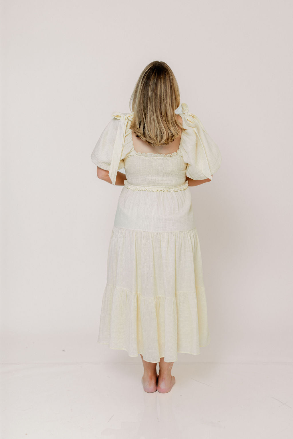 GARMENT DETAILS: Elegant midi dress with a square neckline, statement puffed sleeves, and bow accents on the shoulders. Features a fully smocked bodice, with a multi-tiered skirt.