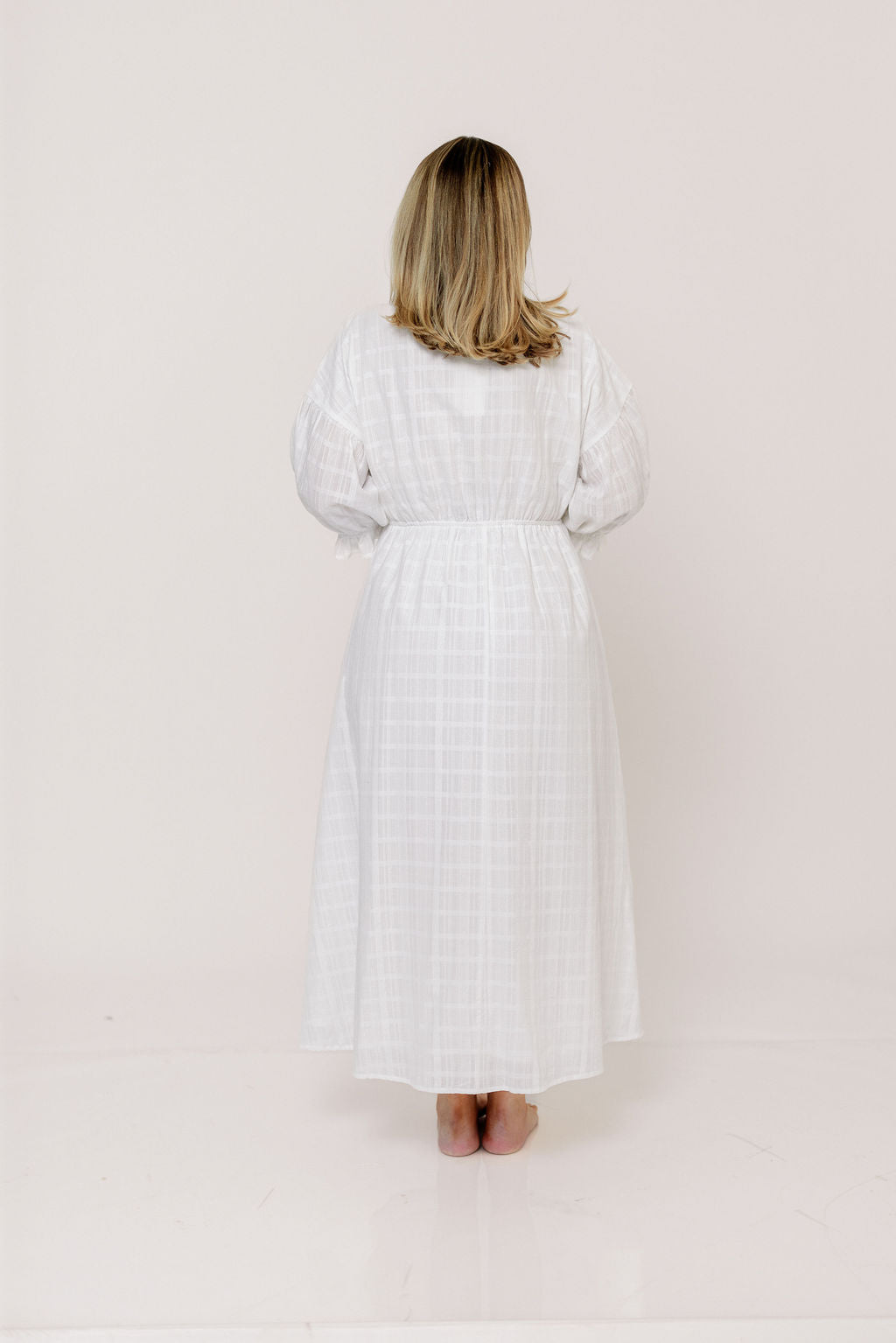 GARMENT DETAILS: Lightweight cotton gauze midi dress. Features V-neckline with self-tie detail, inverted empire waist, and full skirt with in-seam pockets. Finished with 3/4 length balloon sleeves with ruffled accents and eyelet lace trim. This colorway is lined.