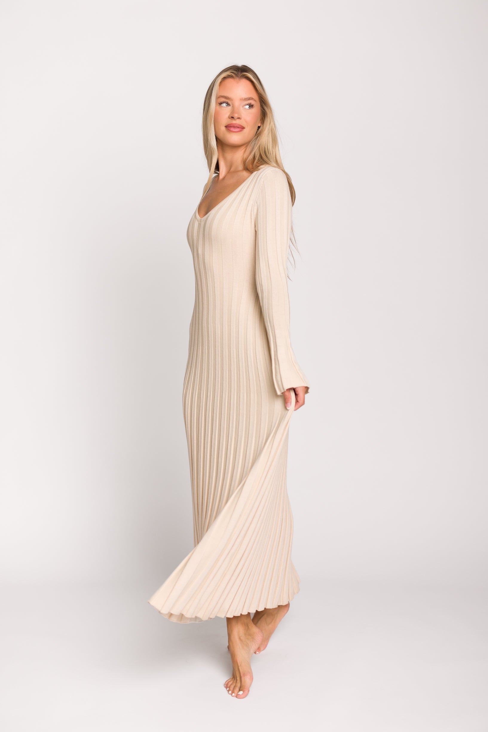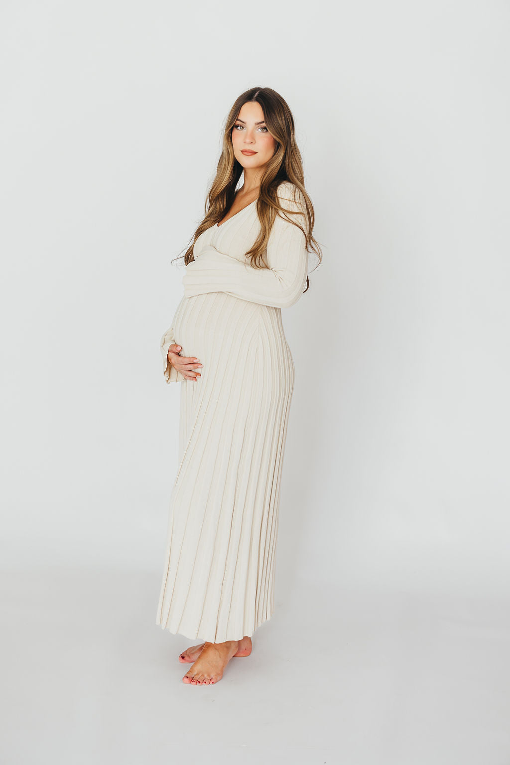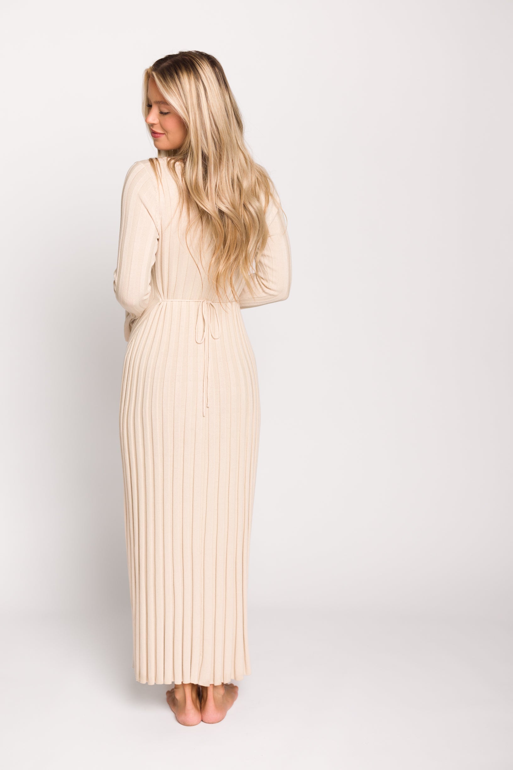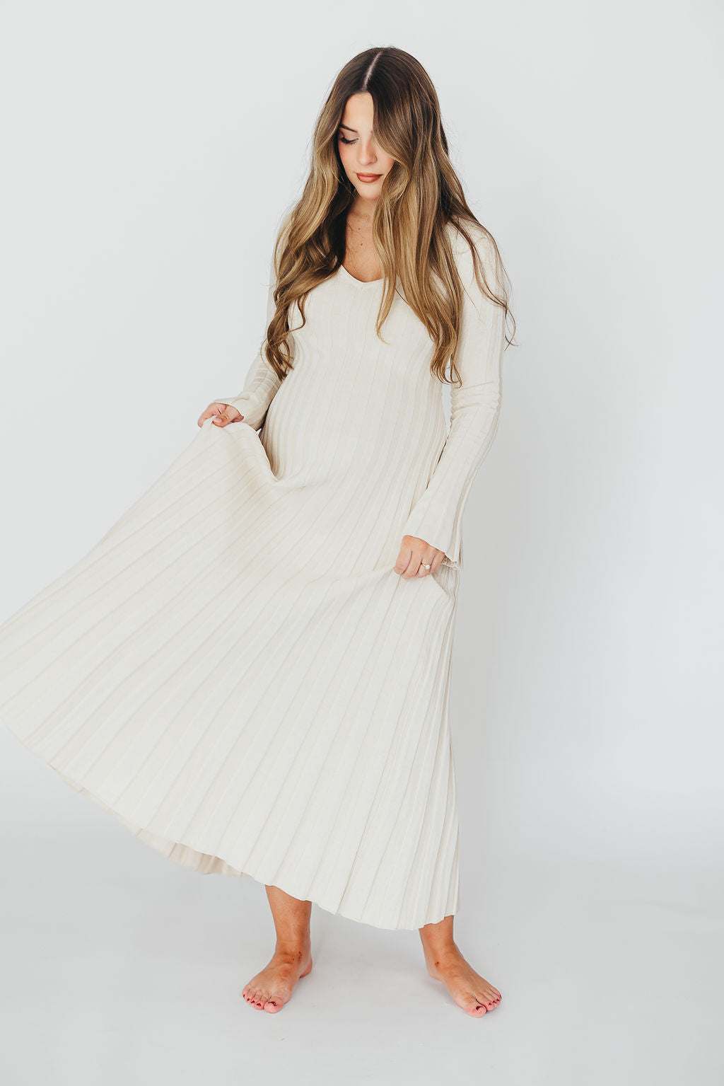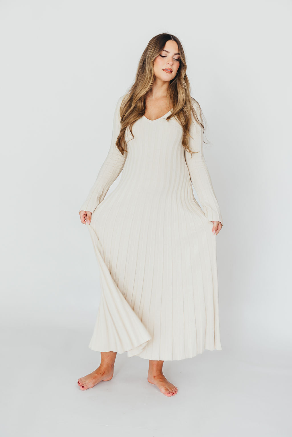 Hadley Long Sleeve V-Neck Knit Maxi Dress in Cream Taupe