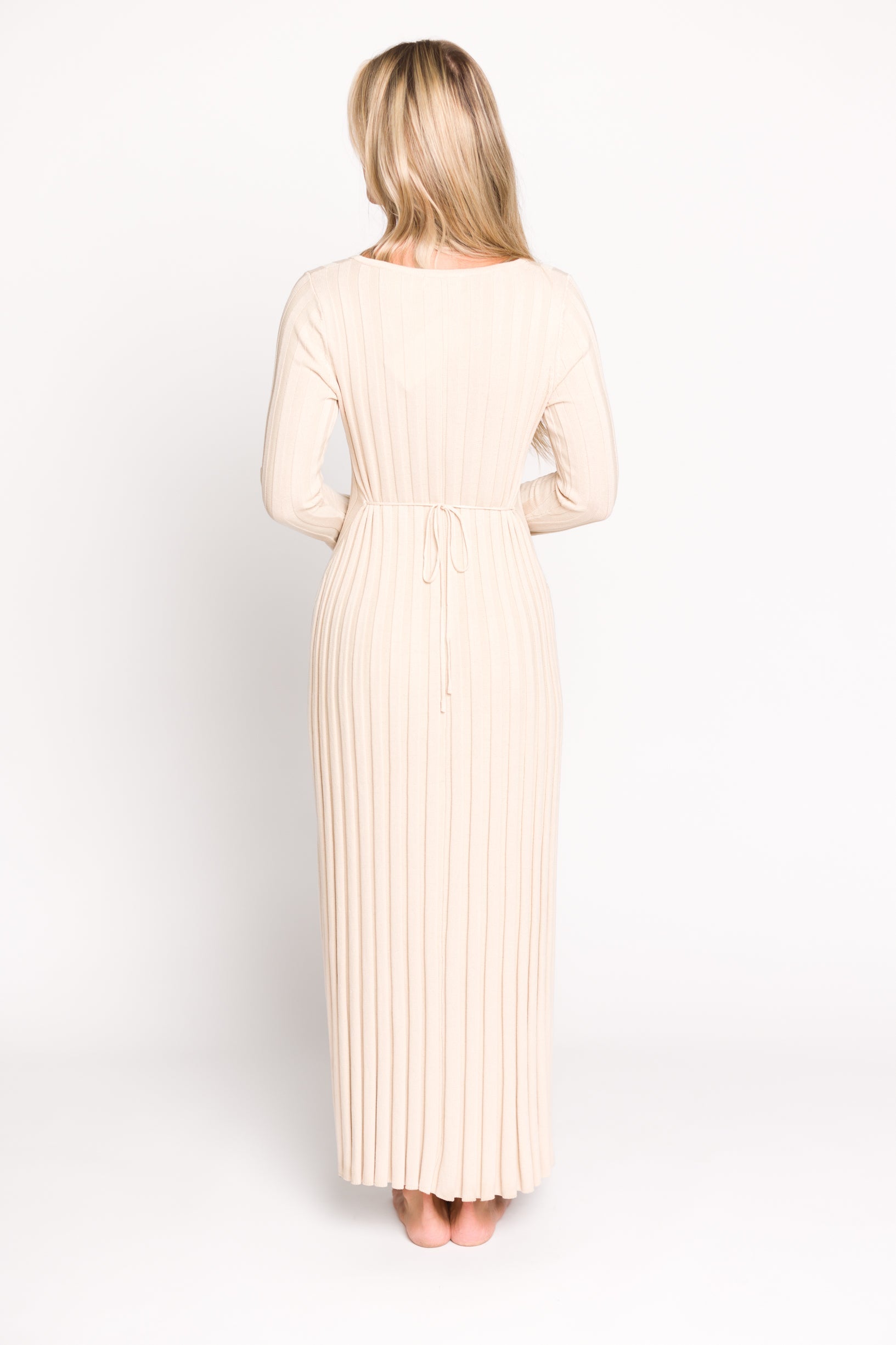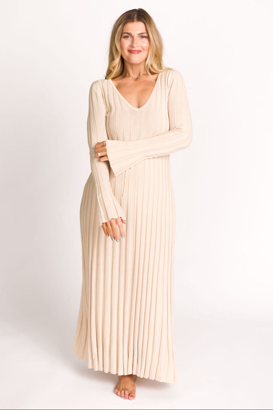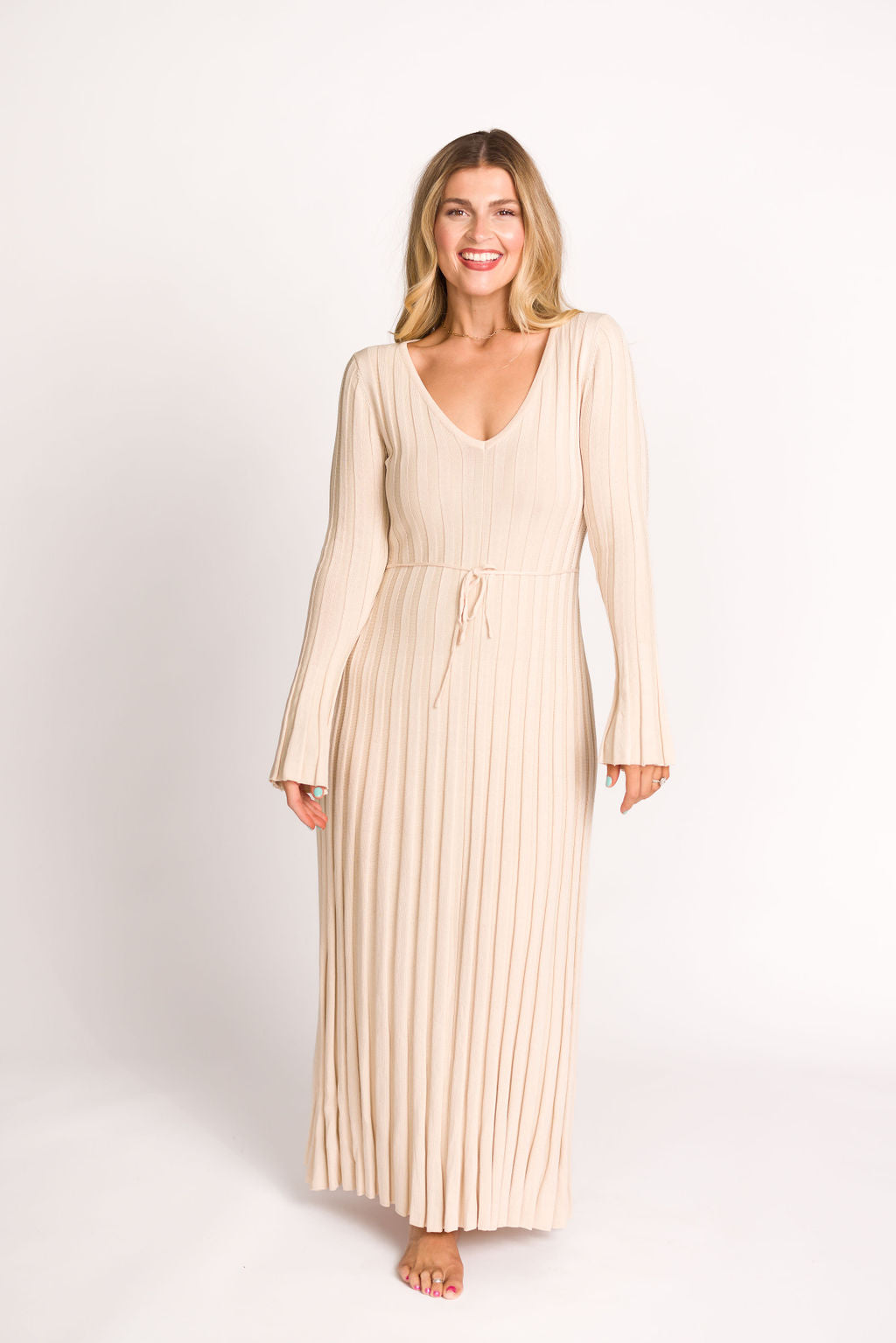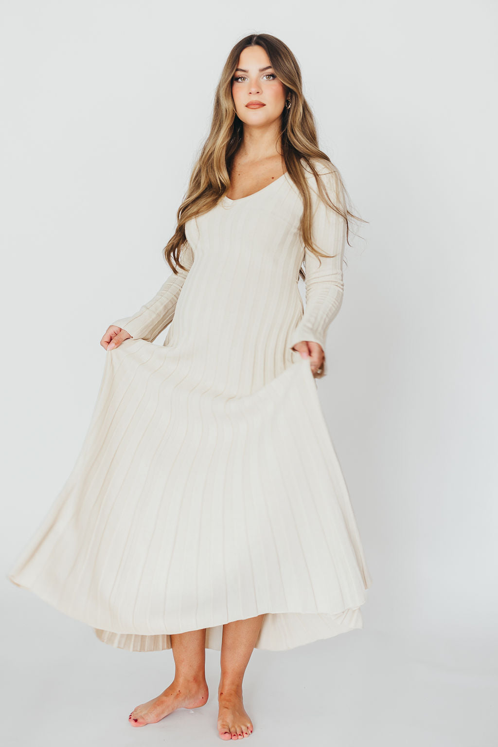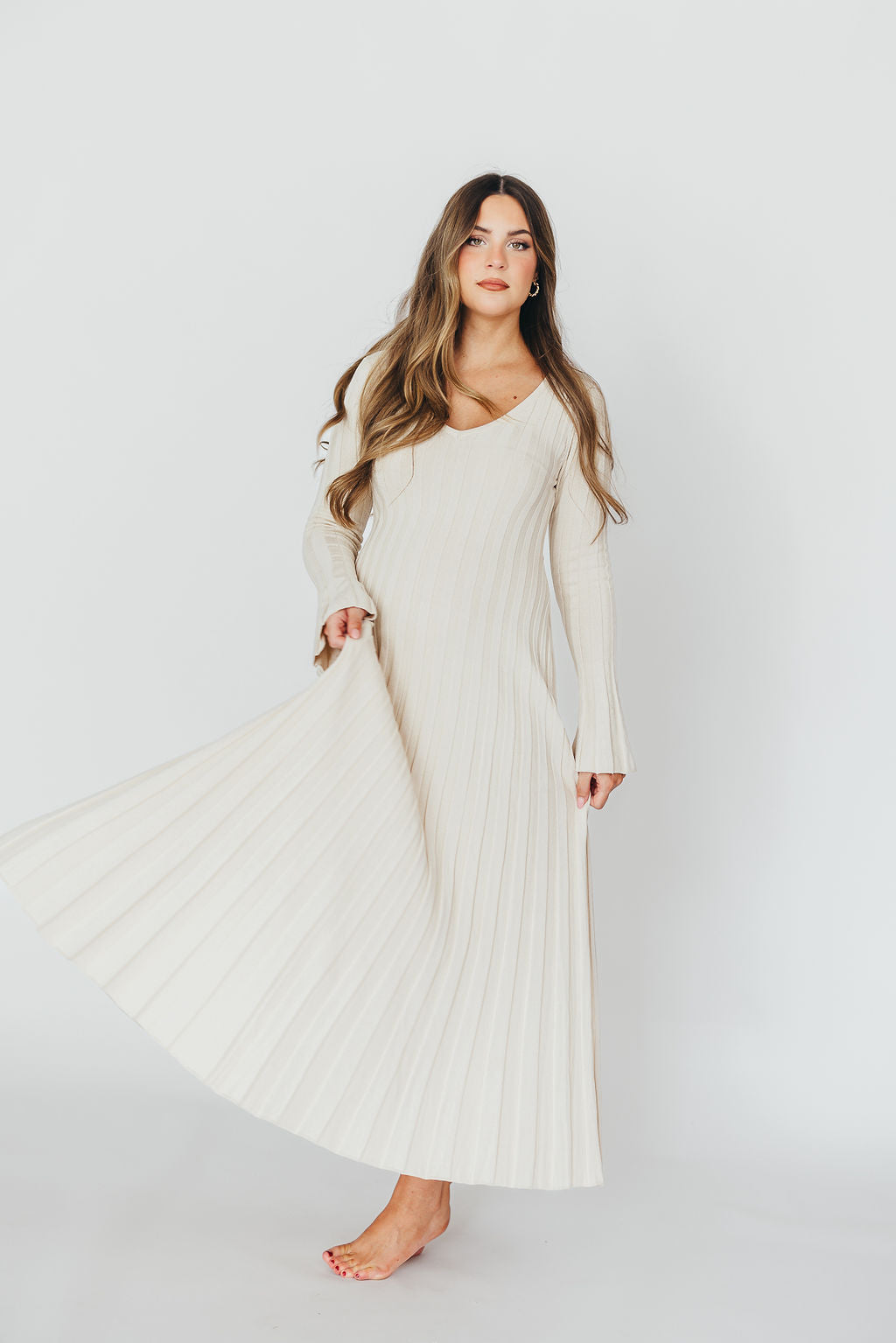 Hadley Long Sleeve V-Neck Knit Maxi Dress in Cream Taupe