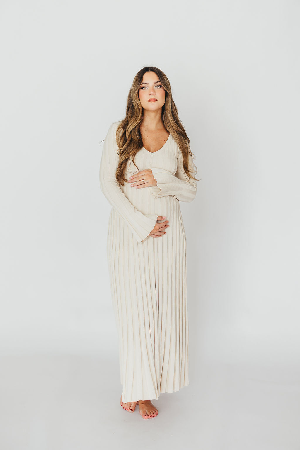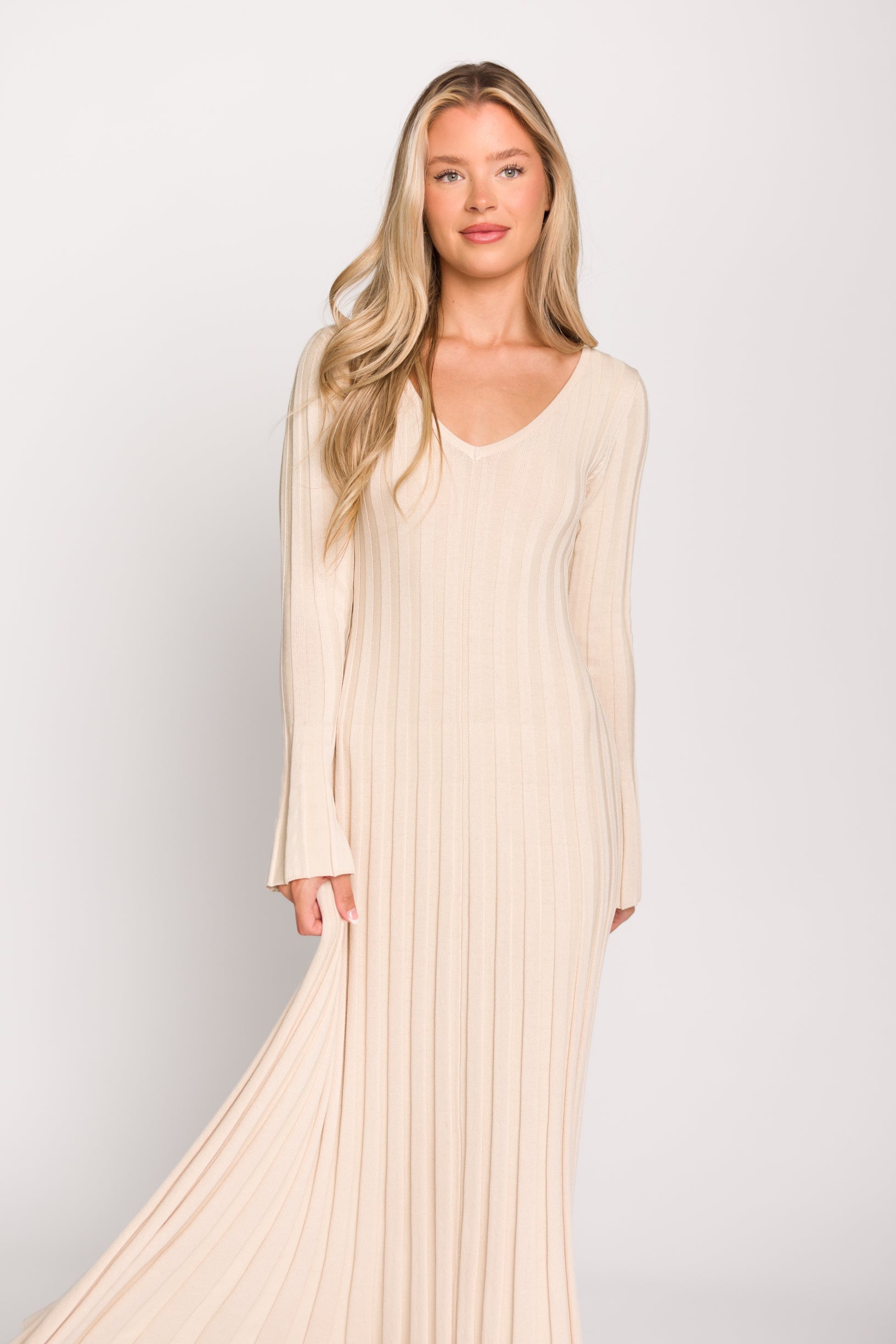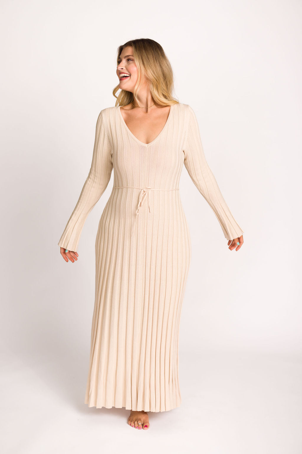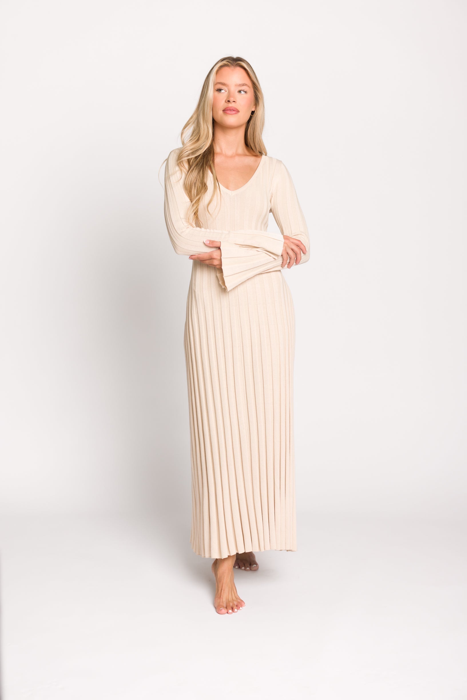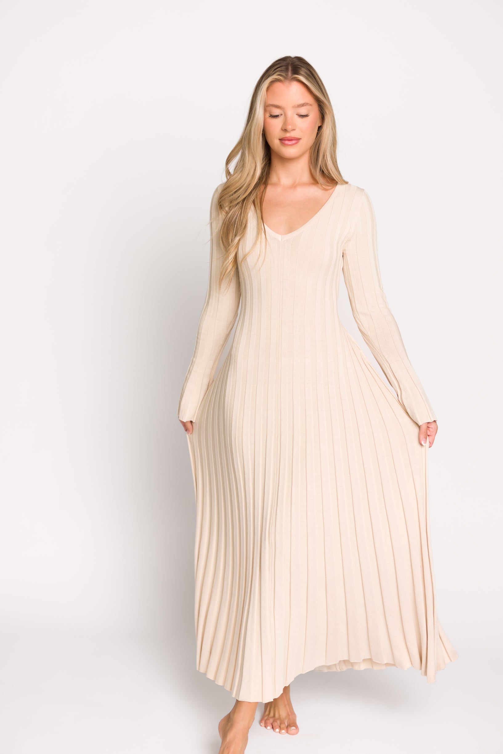 Hadley Long Sleeve V-Neck Knit Maxi Dress in Cream Taupe