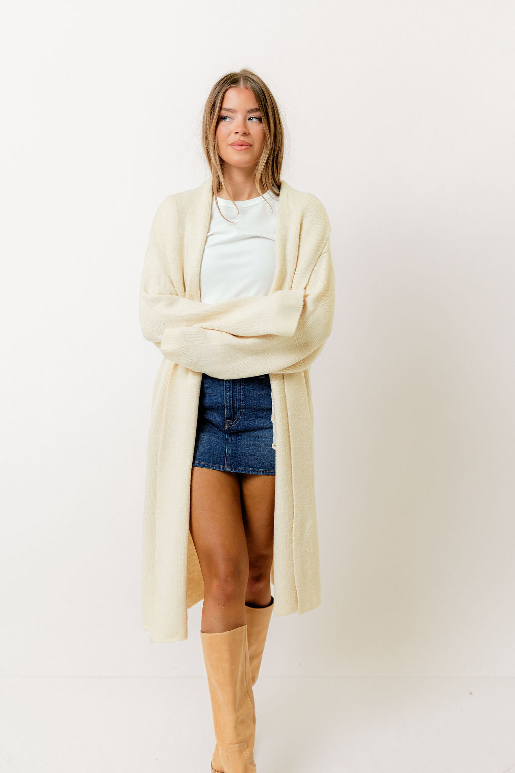 This longline duster sweater has a sleek silhouette and relaxed fit that makes it great for layering all season long! We love it paired with a fitted turtleneck and trousers, or over a favorite athleisure set.