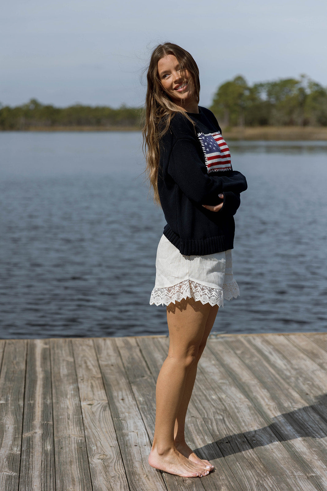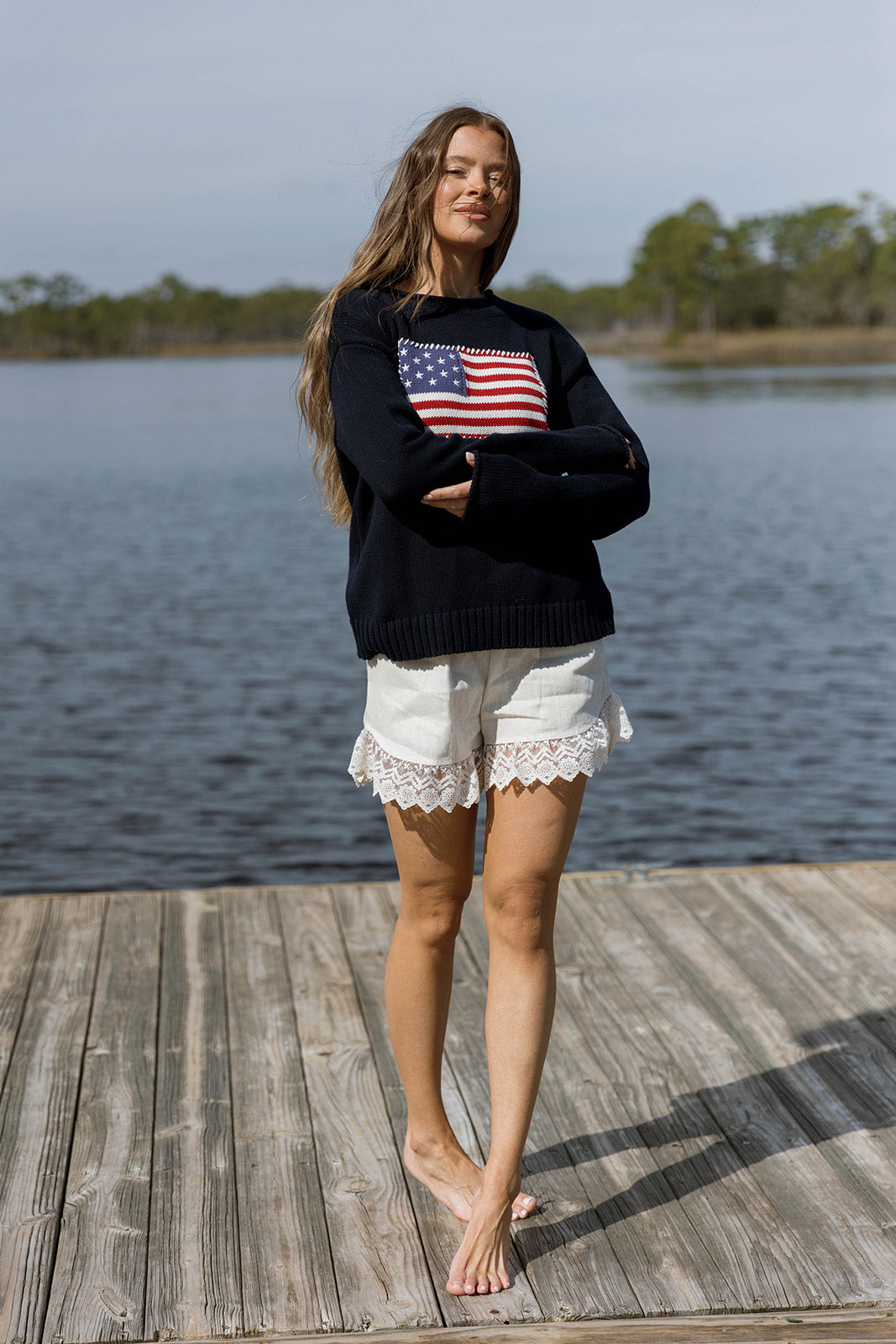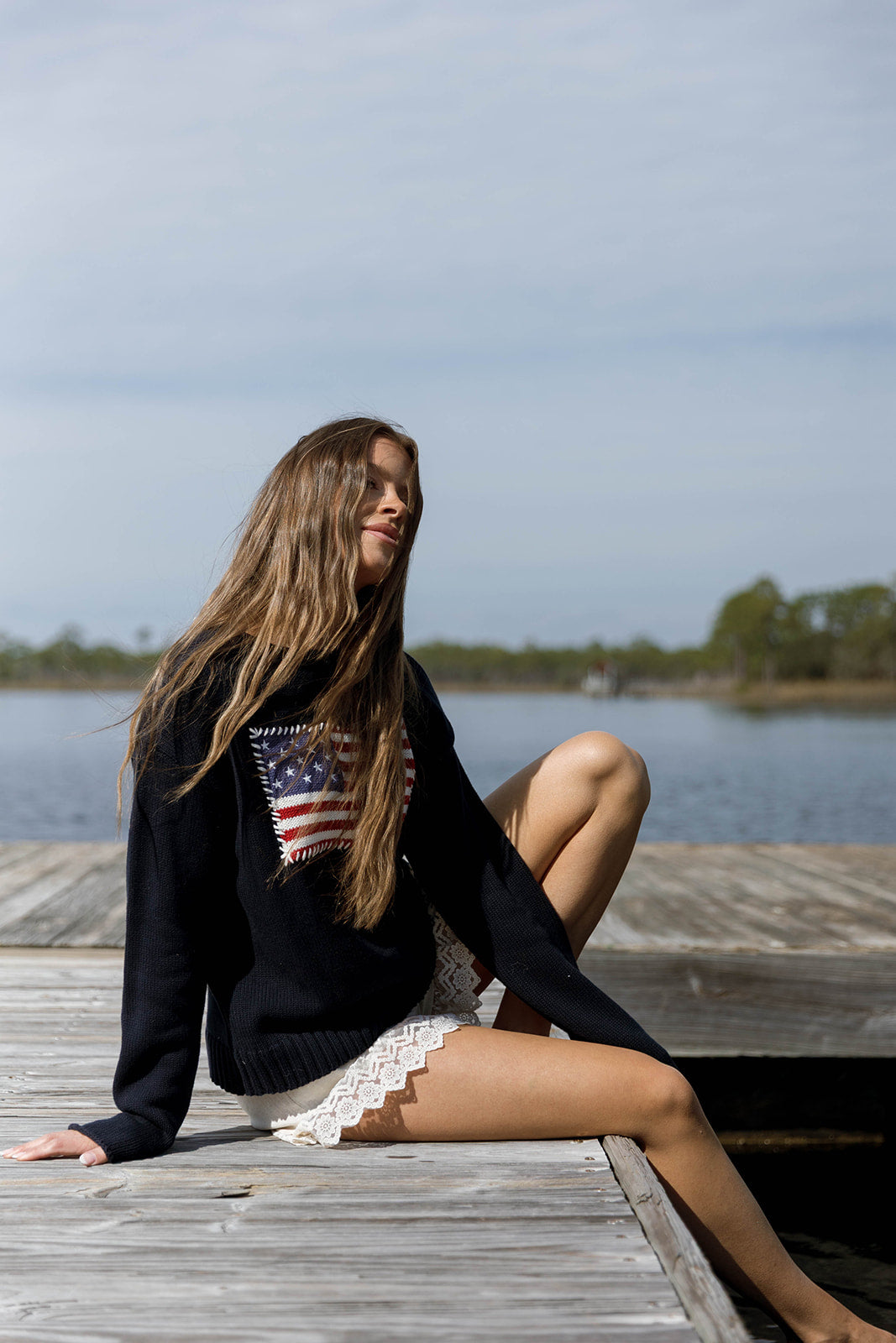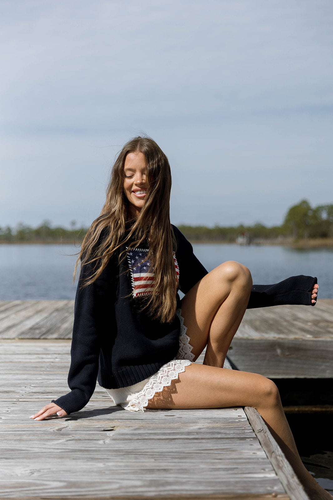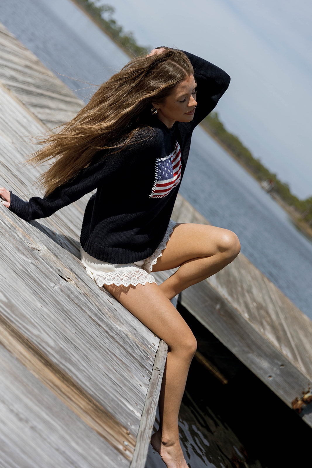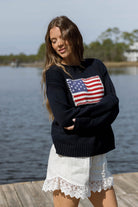 Planning a 4th of July lake trip? Bring the Unity American Flag Sweater along! This premium cotton sweater is crafted in an elegant, midweight knit, with a timeless American flag on the front. It'll keep you comfy and cute, all year long!
