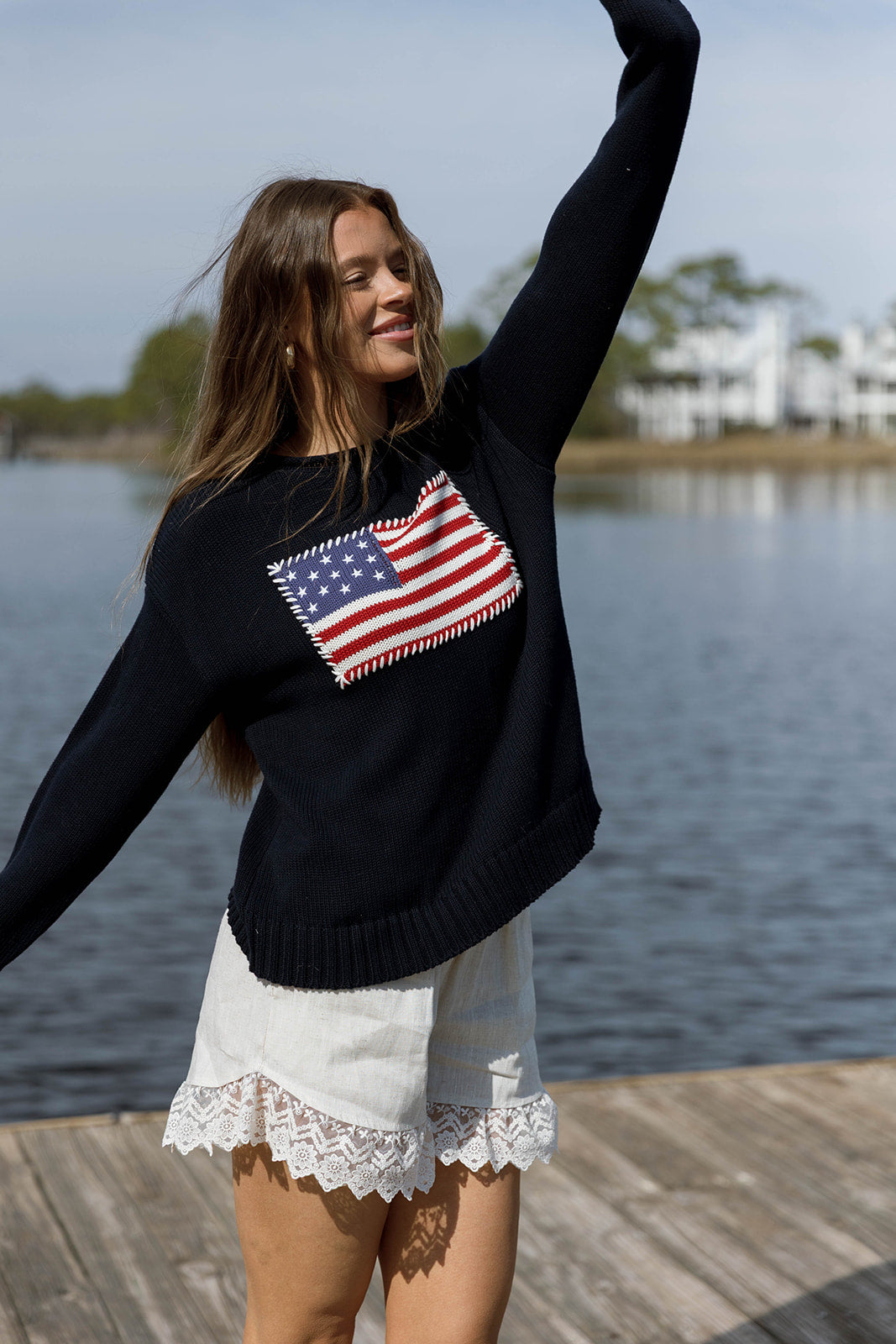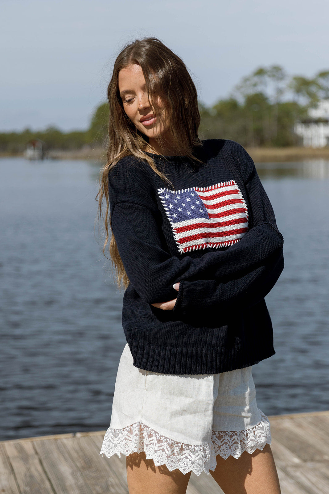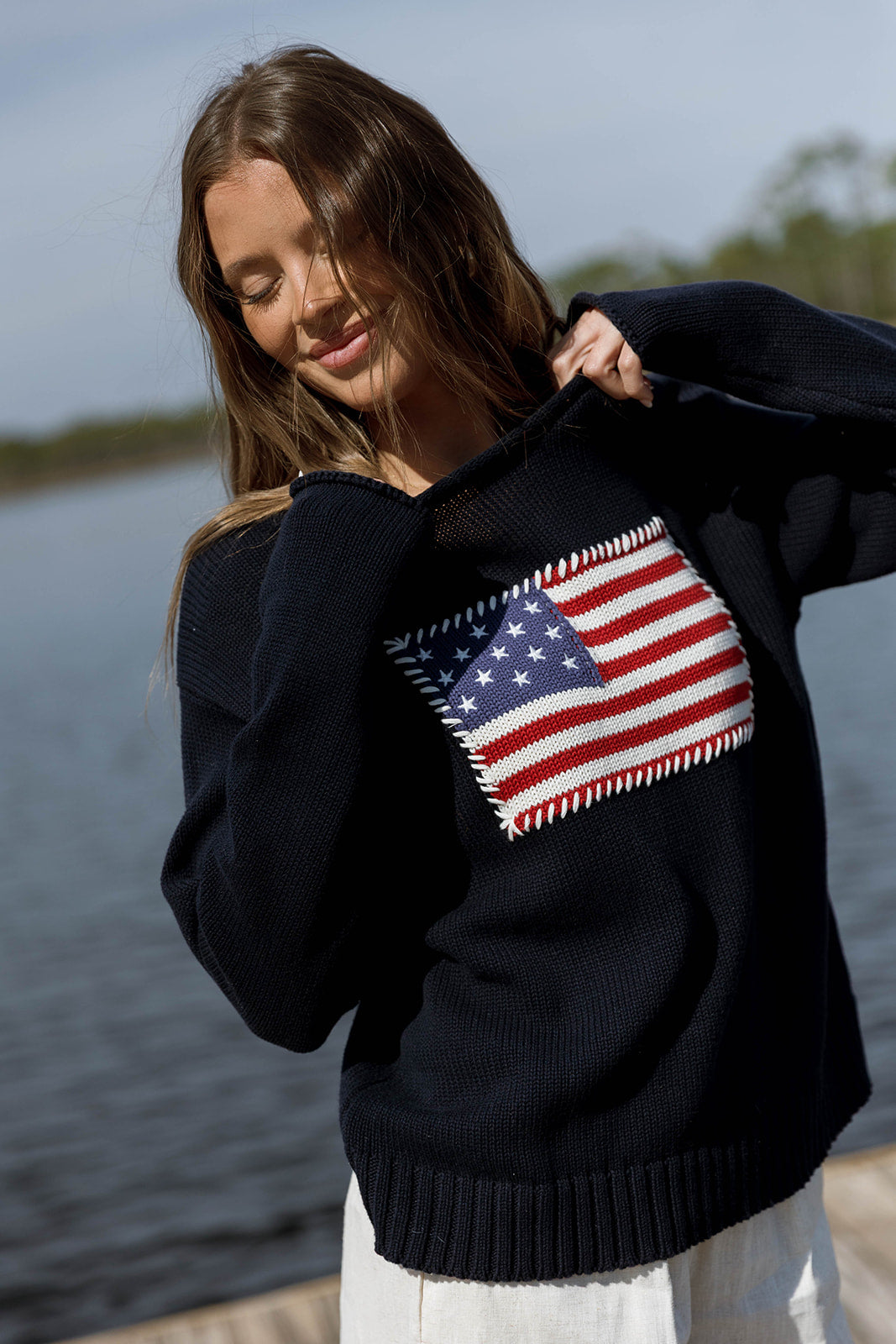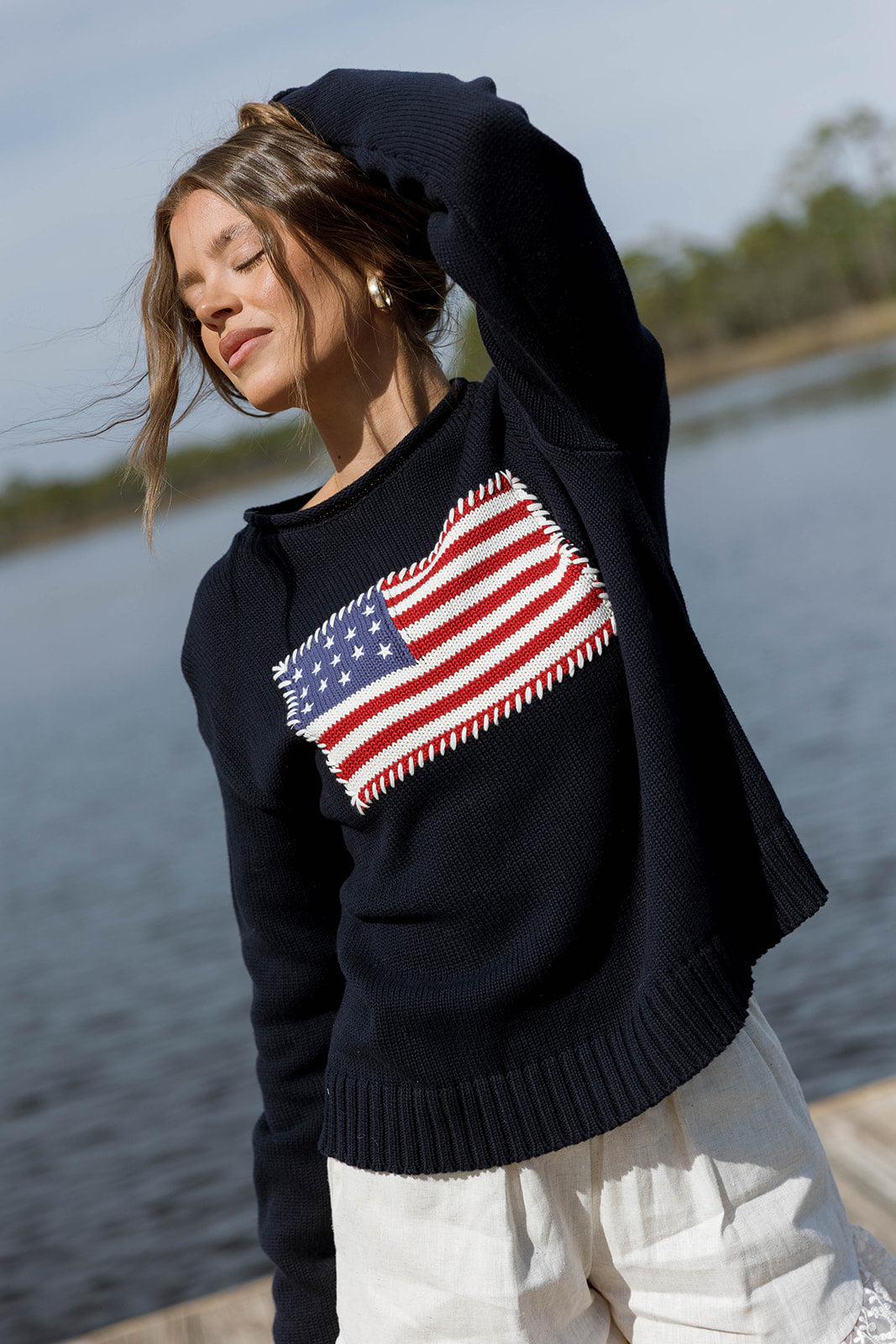 GARMENT DETAILS: Soft 100% cotton knit sweater with American flag detail on the front. Features crewneck, rolled neckline, and ribbed trim.
