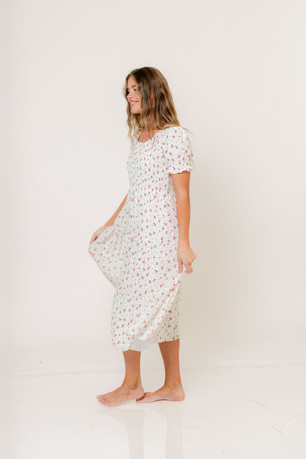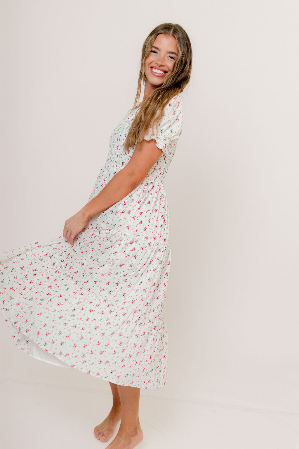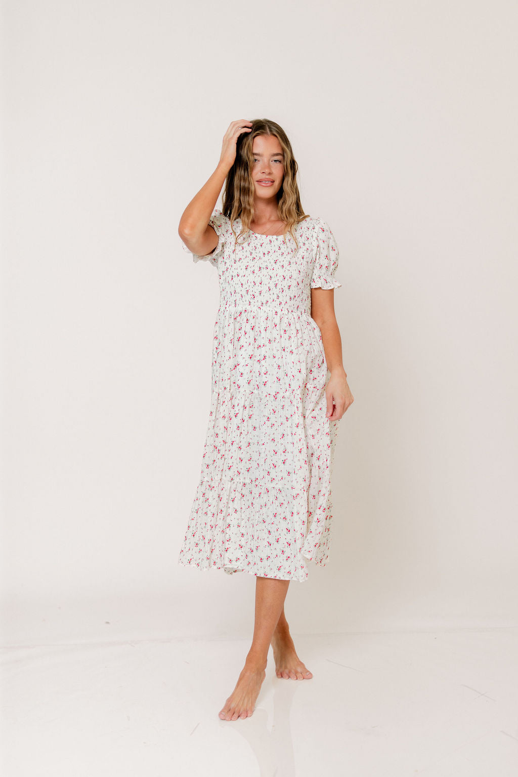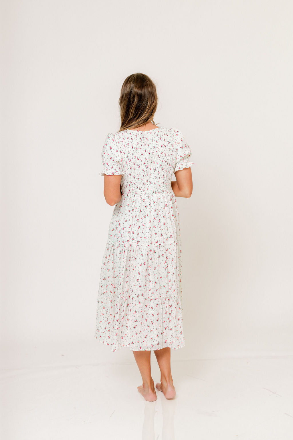 GARMENT DETAILS: Elegant floral midi dress with a modest rounded neckline, puffed short sleeves, and fully smocked bodice with lots of stretch. Features a multi-tiered skirt with dainty ruffle details.