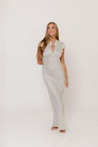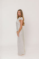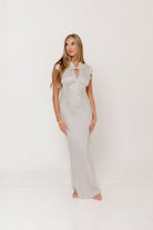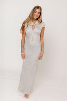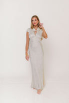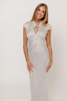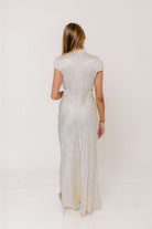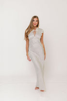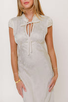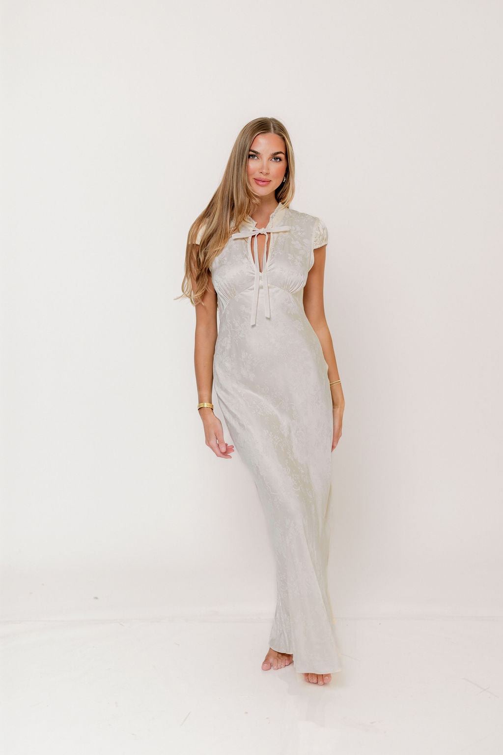 Inspired by the elegance of 1930s Hollywood, the Portofino Maxi Dress brings vintage sophistication to your wardrobe. This ivory satin jacquard gown showcases a distinctive lace collar crowned with a velvet bow detail. The bias-cut silhouette flatters your figure while cap sleeves add a touch of refined charm. An ideal choice for formal events or anyone drawn to timeless, old-world glamour.