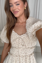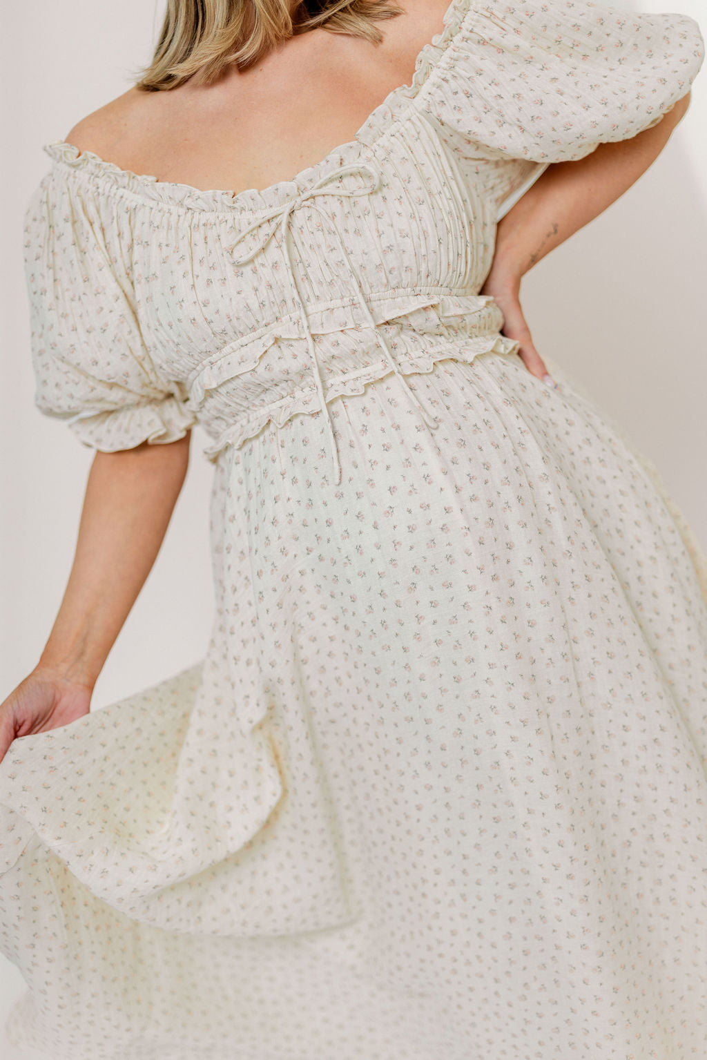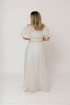 GARMENT DETAILS: Elegant maxi dress in 100% cotton, with short puffed sleeves, tiered and gathered bodice with adjustable tie detail, and ruffle accents throughout. Finished with a full lining. Elasticated neckline can be worn on or off the shoulders.